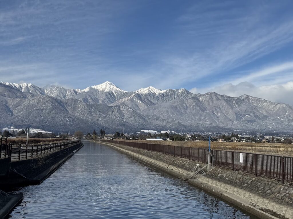 北アルプスの山なみが、ごく自然に日常の風景としてそこにあります。